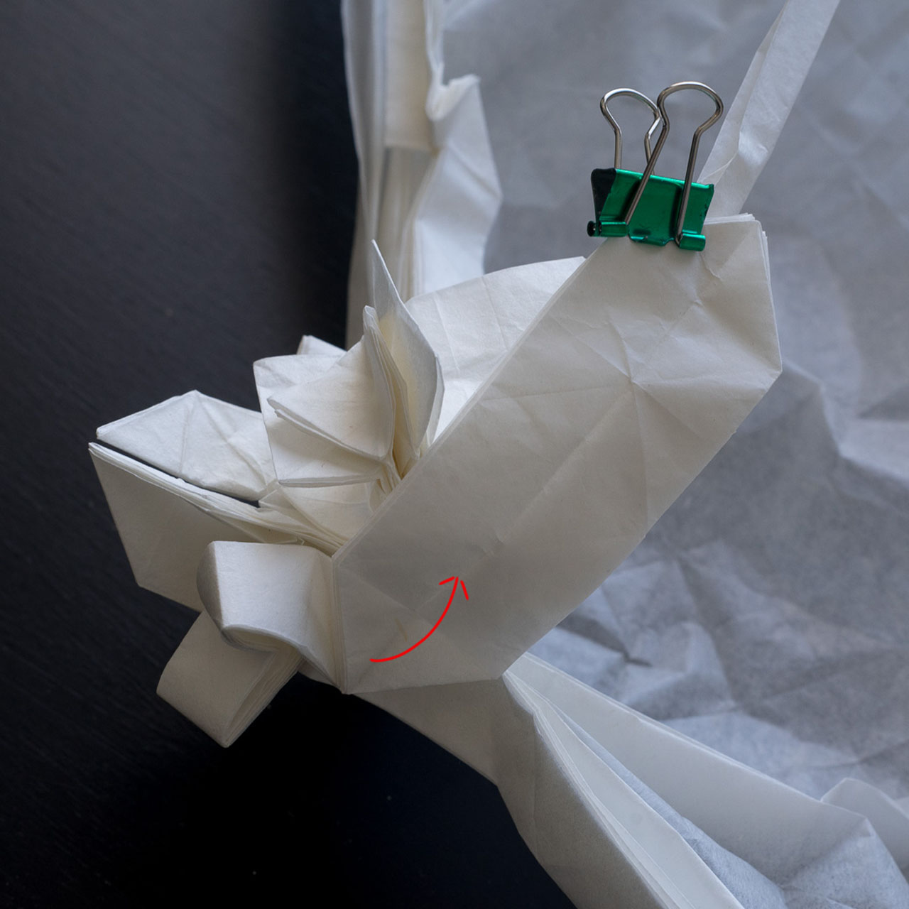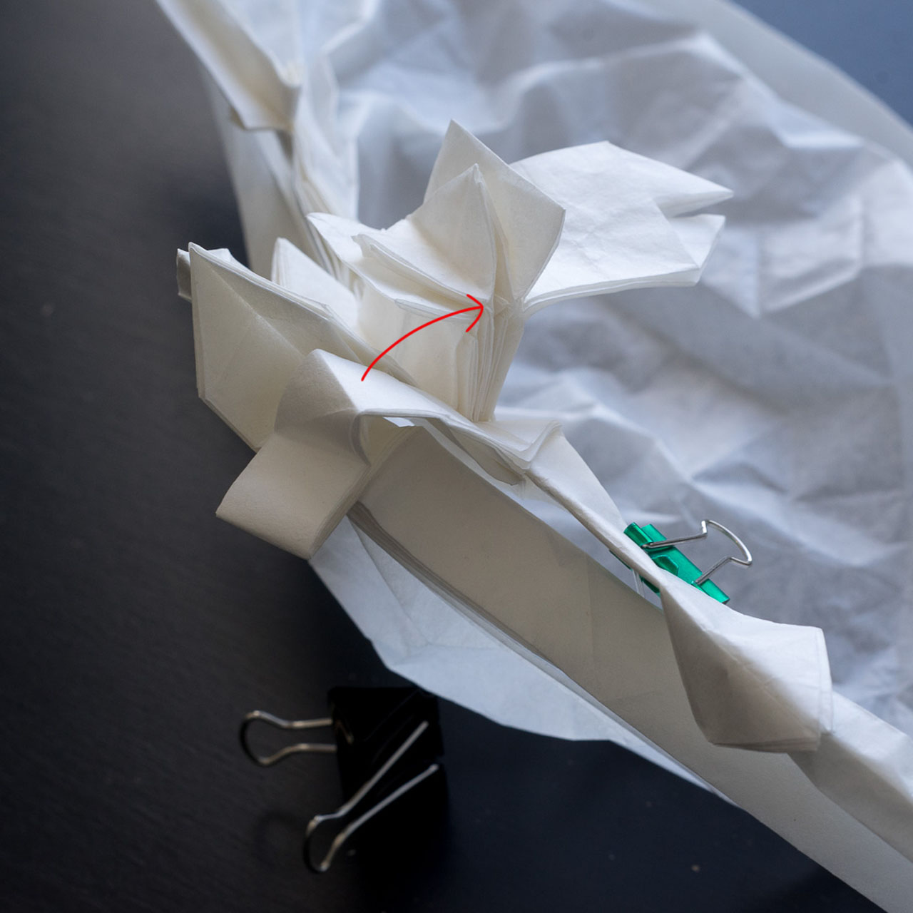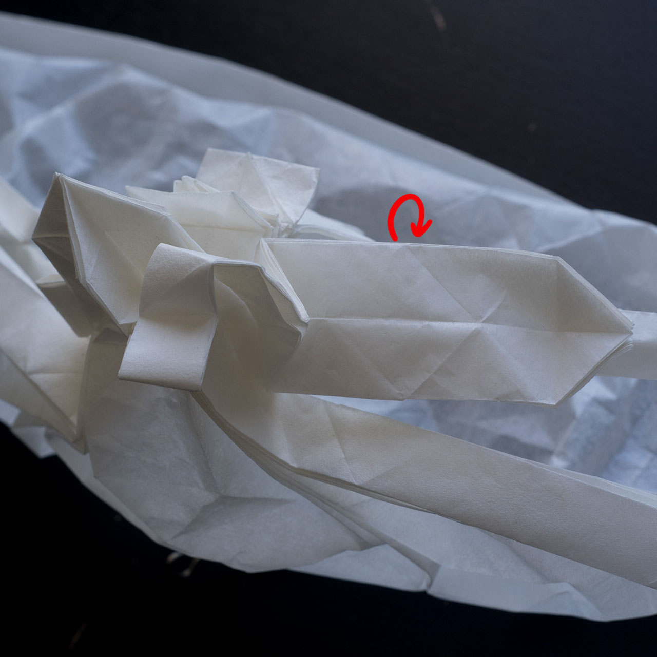 For the skirt, you spread the layers and shape it to sit with the leg. Be careful with the edge layer, it will be very stressed. I left it open for the rest of the folding process to prevent ripping.