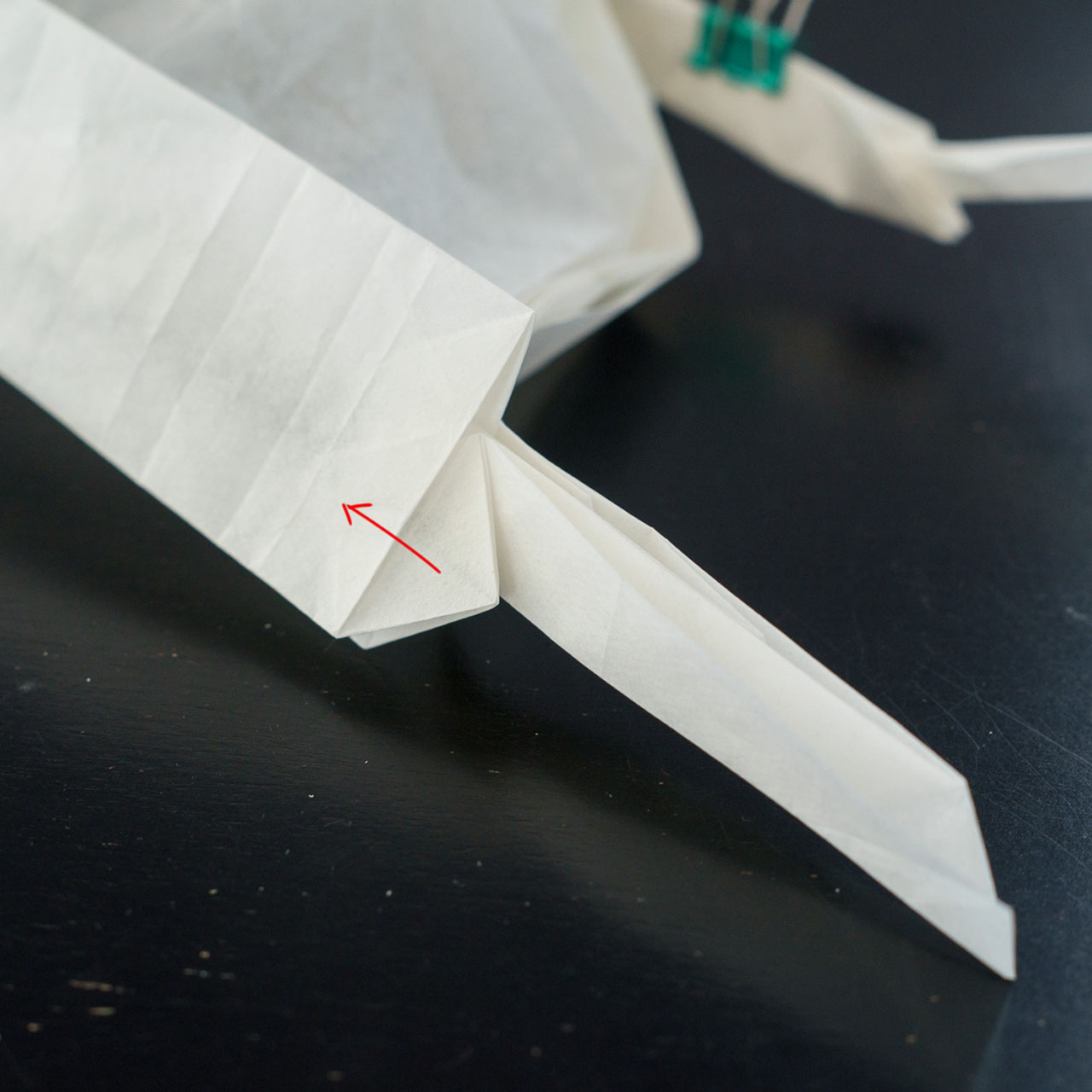 When folding the legs, start doing the inner part first and and fold it like in the picture. You do the same steps on both sides of the thigh armor. Then you can sink the flap in and begin to open the edge of the paper.