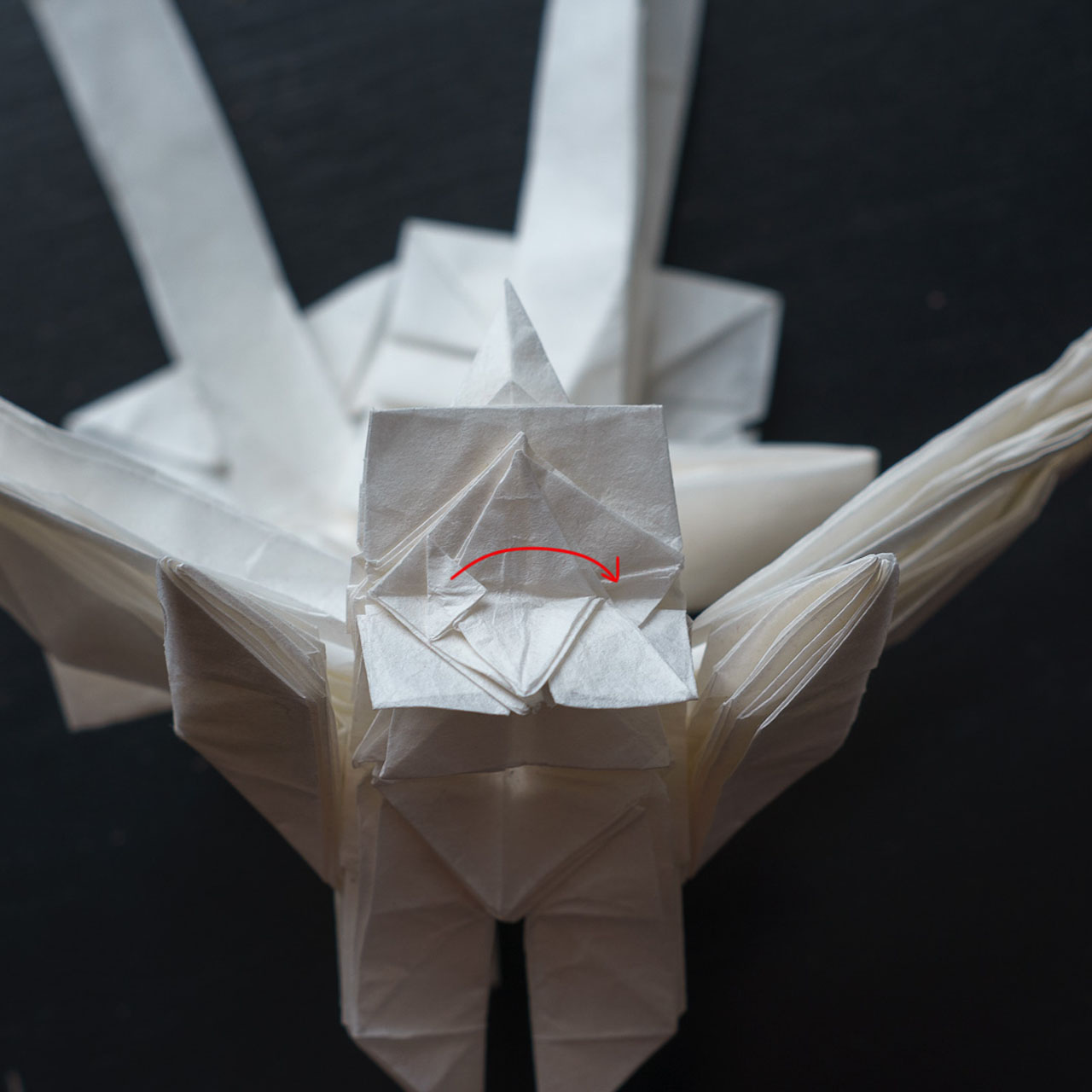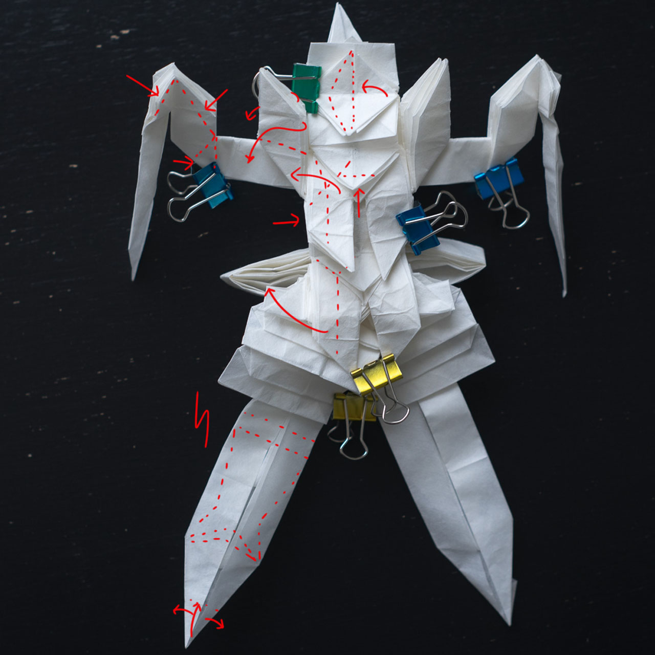 I recommend to start the collapsing of the model from the head and arms. You will need these folded for the shoulder armor, which is the most difficult part of the model. You will need to fold the arms reversed from the armpits, so they stretch out to the sides when folded. You don’t need to worry about the elbow part yet.