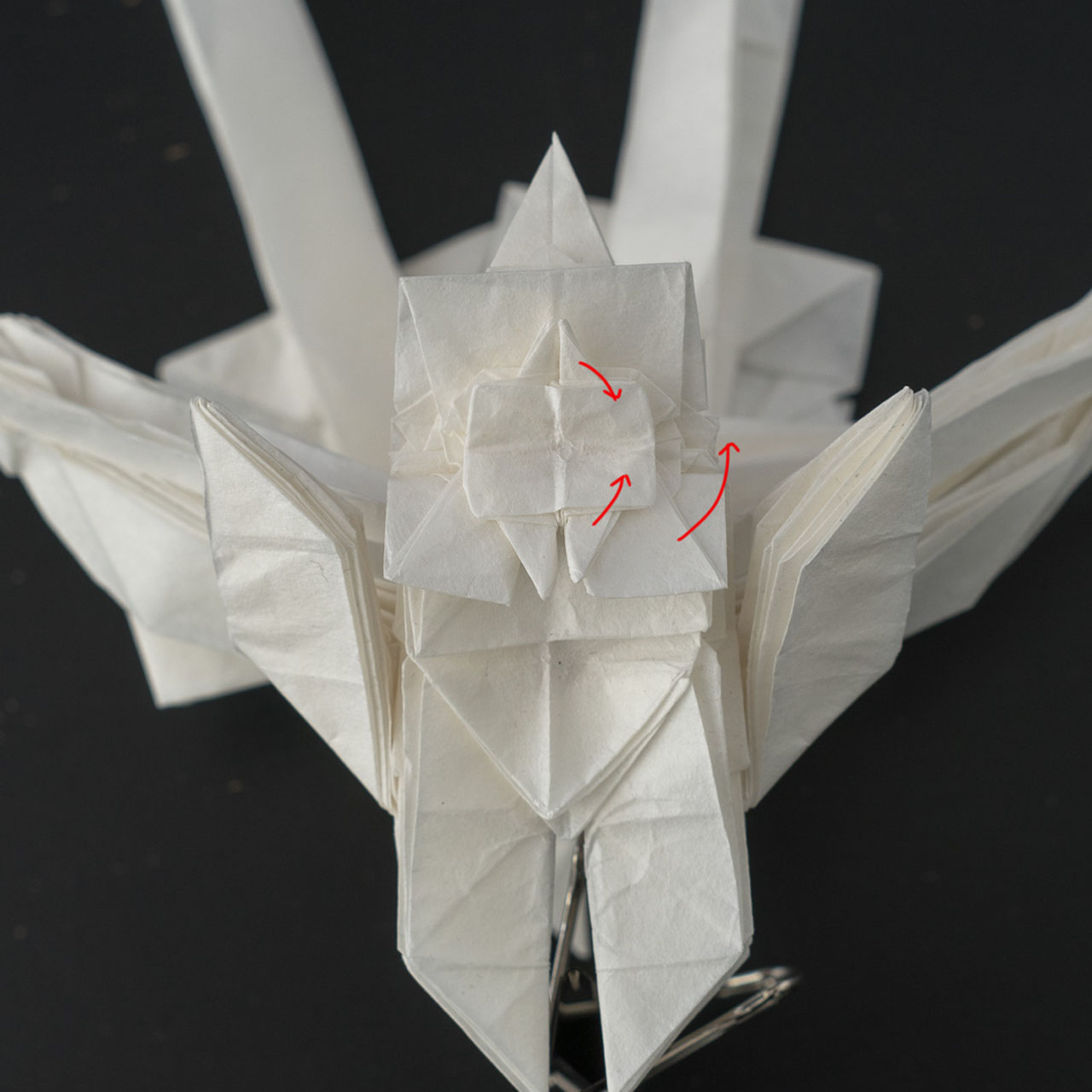 On chest piece, you will sink the outer edges in to make it thinner and then you spread the flap open to the side. from the two tips you can fold small spiky details to the side.
